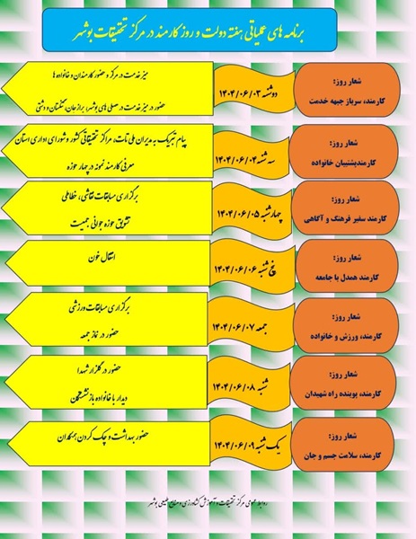 برپایی نمایشگاه دستاوردهای تحقیقاتی، اجرای میز خدمت در مصلی نمازجمعه دشتستان و بوشهر، ارسال پیام تبریک، معرفی کارمند نمونه، برگزاری مسابقات فرهنگی، برگزاری مسابقات ورزشی، حضور در گلزار شهدا، دیدار با خانواده بازنشستگان و برنامه‌های متنوع دیگر است .