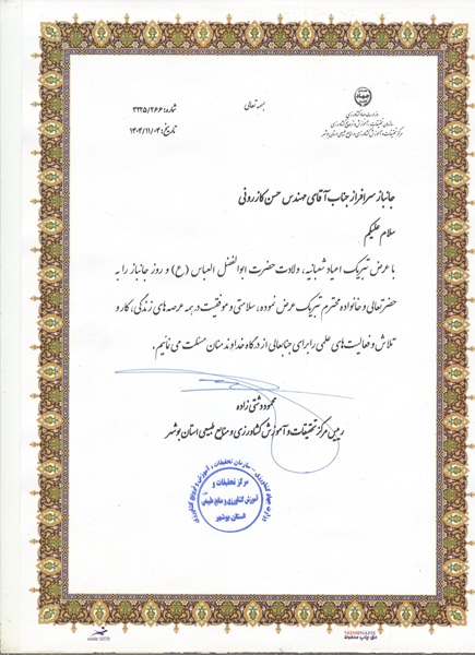 در پایان این مراسم، به‌رسم قدردانی و احترام، از تلاش‌ها و ایثارگری‌های همکار جانباز حسن کازرونی تجلیل به عمل آمد و لوح سپاس به ایشان اهدا شد.
