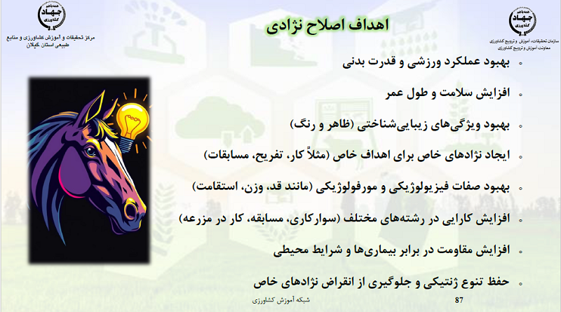 در ادامه این دوره آموزشی در خصوص محورهای کلیدی از جمله تاریخچه اصلاح نژاد اسب‌ها، مراحل برنامه اصلاح نژادی در اسب، معیارها و صفات مورد نظر برای اصلاح نژاد و روش‌های تعیین اهداف اصلاح نژادی مورد بحث و بررسی قرار گرفت. بخش ویژه‌ای از این دوره به بررسی اقدامات انجام شده بر روی اسب نژاد کاسپین اختصاص یافت، که یکی از سرمایه‌های ملی کشور در صنعت دام محسوب می‌شود.