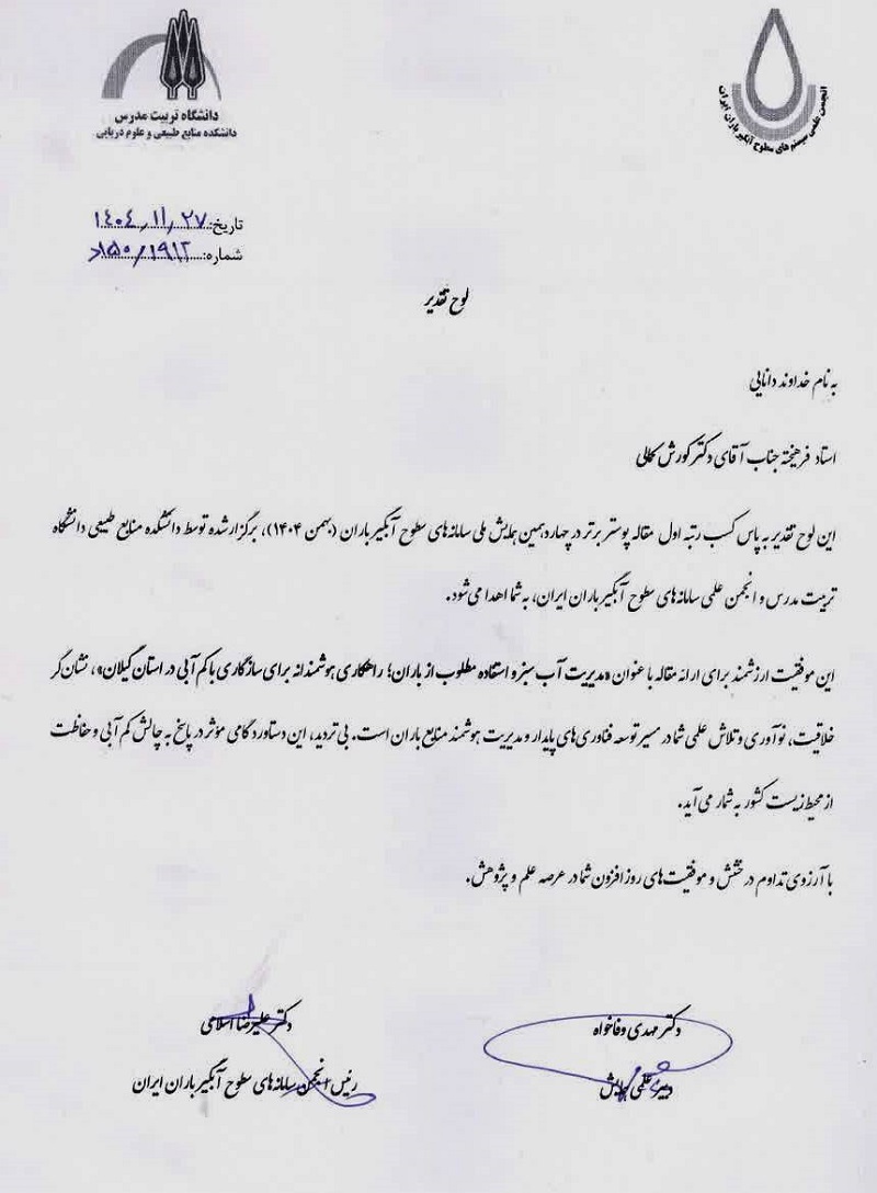 مقاله ایشان با عنوان: "مدیریت آب سبز و استفاده مطلوب از باران؛ راهکاری هوشمندانه برای سازگاری با کمآبی در استان گیلان" پس از ارزیابیهای دقیق توسط داوران متخصص، موفق به کسب رتبه اول مقاله پوستر، برتر گردید.