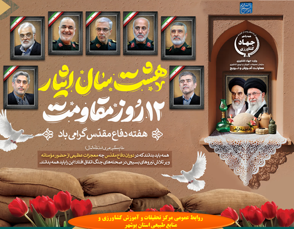 به گزارش روابط عمومی مرکز تحقیقات و آموزش کشاورزی و منابع طبیعی استان بوشهر، همزمان با فرا رسیدن هفته دفاع مقدس، مراسمی با هدف گرامیداشت یاد و خاطره شهدا و تجلیل از جانبازان و رزمندگان هشت سال دفاع مقدس در سالن شهید محمود خاج برگزار شد.