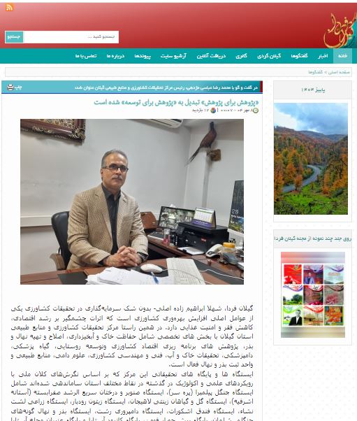 به گزارش روابط عمومی مرکز تحقیقات و آموزش کشاورزی و منابع طبیعی گیلان؛ در مصاحبه اختصاصی ماهنامه «گیلان فردا»، محمدرضا عباسی مژدهی، رئیس مرکز؛ با نگاهی آینده‌نگرانه به چالش‌ها و فرصت‌های بخش کشاورزی استان گیلان پرداخت.