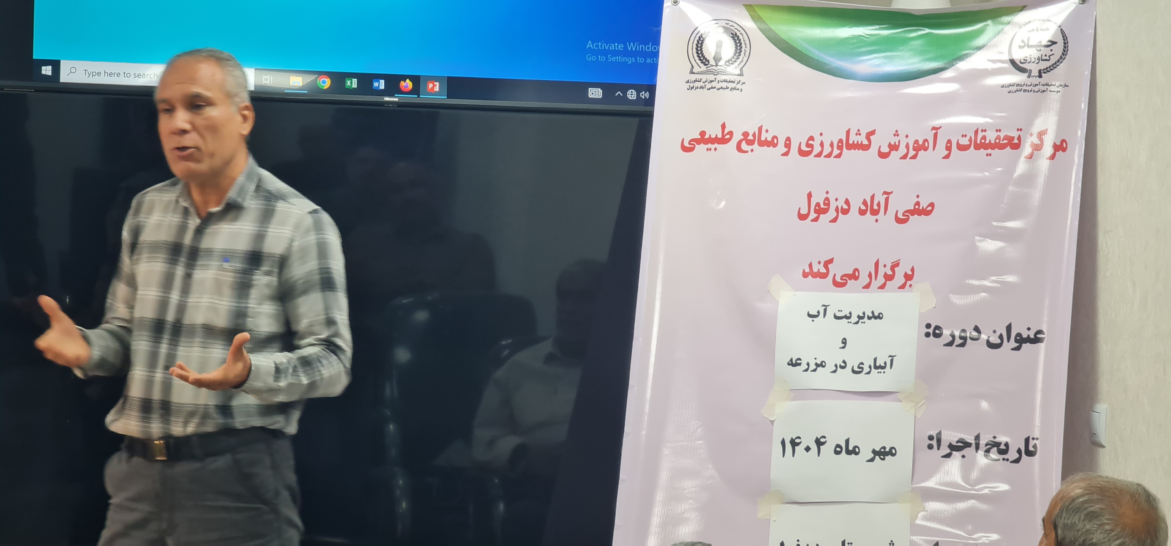 به گزارش روابط‌عمومی مرکز تحقیقات و آموزش کشاورزی و منابع طبیعی صفی‌آباد دزفول، به همت اداره آموزش بهره‌برداران و مشاغل کشاورزی مرکز و در راستای آگاهی‌بخشی به کشاورزان و ترویج مصرف بهینه آب، در روز سه‌شنبه مورخ ۱۵ مهر دوره آموزشی «مدیریت آبیاری در مزرعه» با تدریس محمد خرمیان؛ عضو هیأت علمی مرکز تحقیقات و آموزش کشاورزی و منابع طبیعی صفی‌آباد دزفول و با همکاری شرکت بهره‌برداری از شبکه آبیاری ناحیه شمال خوزستان برگزار شد.