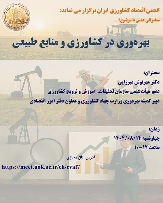 انجمن اقتصاد کشاورزی ایران برگزار مینماید: سخنرانی علمی با موضوع بهرهوری در کشاورزی و منابع طبیعی - سخنران دکتر مهرنوش میرزایی معاون دفتر امور اقتصادی سازمان تات و دبیر کمیته بهرهوری