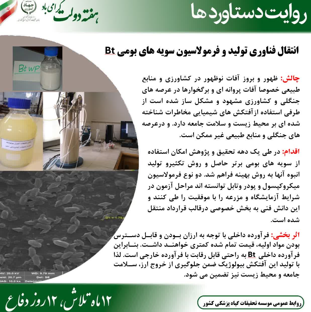 انتقال فناوری تولید و فرمولاسیون سویه های بومی Bt ۲۸ شهریور ۱۴۰۴ | ۱۵:۱۷ دستاودهای بیولوژیک تعداد بازدید:۱