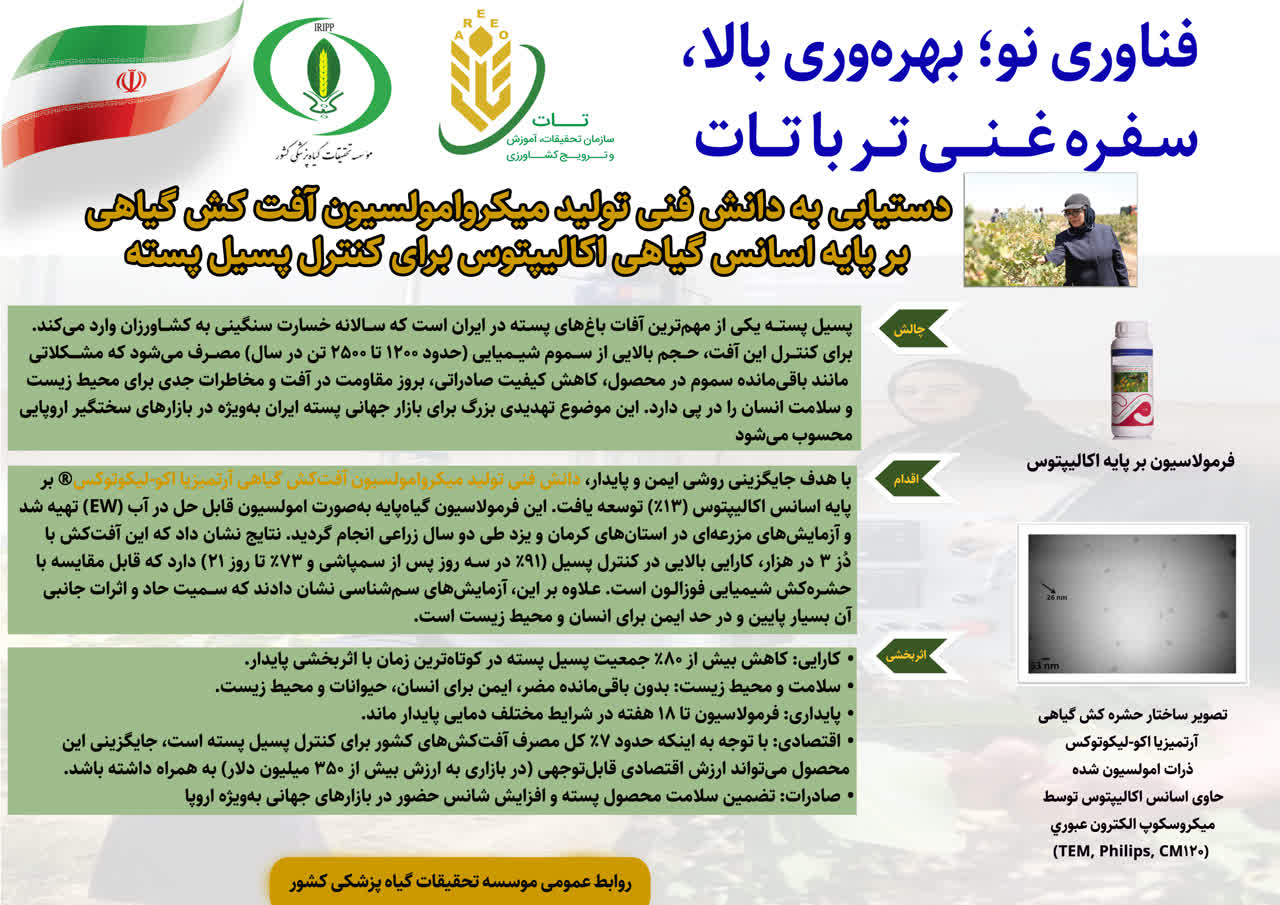 دستیابی به دانش فنی تولید میکروامولسیون آفت کش گیاهی بر پایه اسانس گیاهی اکالیپتوس برای کنترل پسیل پسته ۲۸ شهریور ۱۴۰۴ | ۱۵:۲۲ دستاوردهای آفت کشها تعداد بازدید:۶