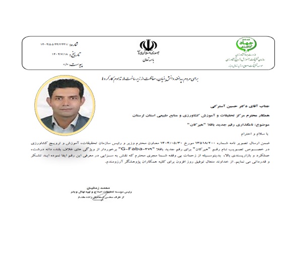 به گزارش روابط عمومی مرکز تحقیقات و آموزش کشاورزی و منابع طبیعی استان لرستان، در همین راستا، دکتر حسین آسترکی محقق و پژوهشگر این مرکز با توجه به نامگذاری قم جدید باقلا با نام "هیرکان" برای جمعیت اصلاح شده G-Faba-479 با ویژگیهای زغلاف بلند، دانه درشت، عملکرد و بازارپسندی بالا به عنوان مجری از سوی دکتر محمد زمانیان رئیس موسسه تحقیقات اصلاح و تهیه نهال و بذرکشور مورد تقدیر قرار گرفت.