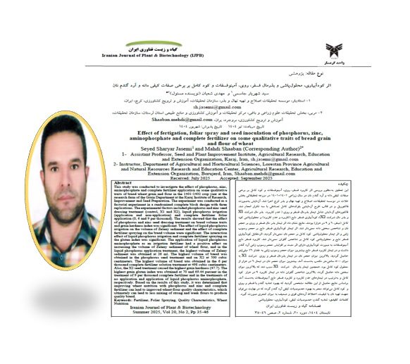 چاپ مقاله با عنوان: باثر کودآبیاری، محلولپاشی و بذرمال فسفر، روی، آمینوفسفات و کود کامل بر برخی صفات کیفی دانه و آرد گندم نان