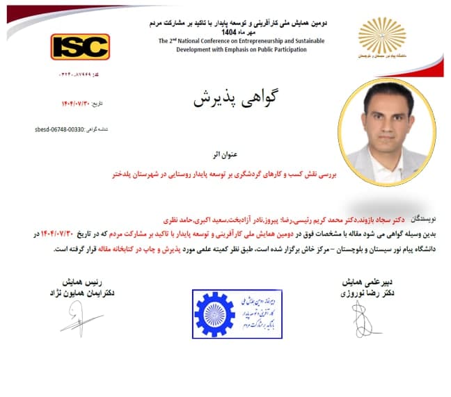 پذیرش مقاله با عنوان: بررسی نقش کسب و کارهای گردشگری بر توسعه پایدار روستایی در شهرستان پلدختر