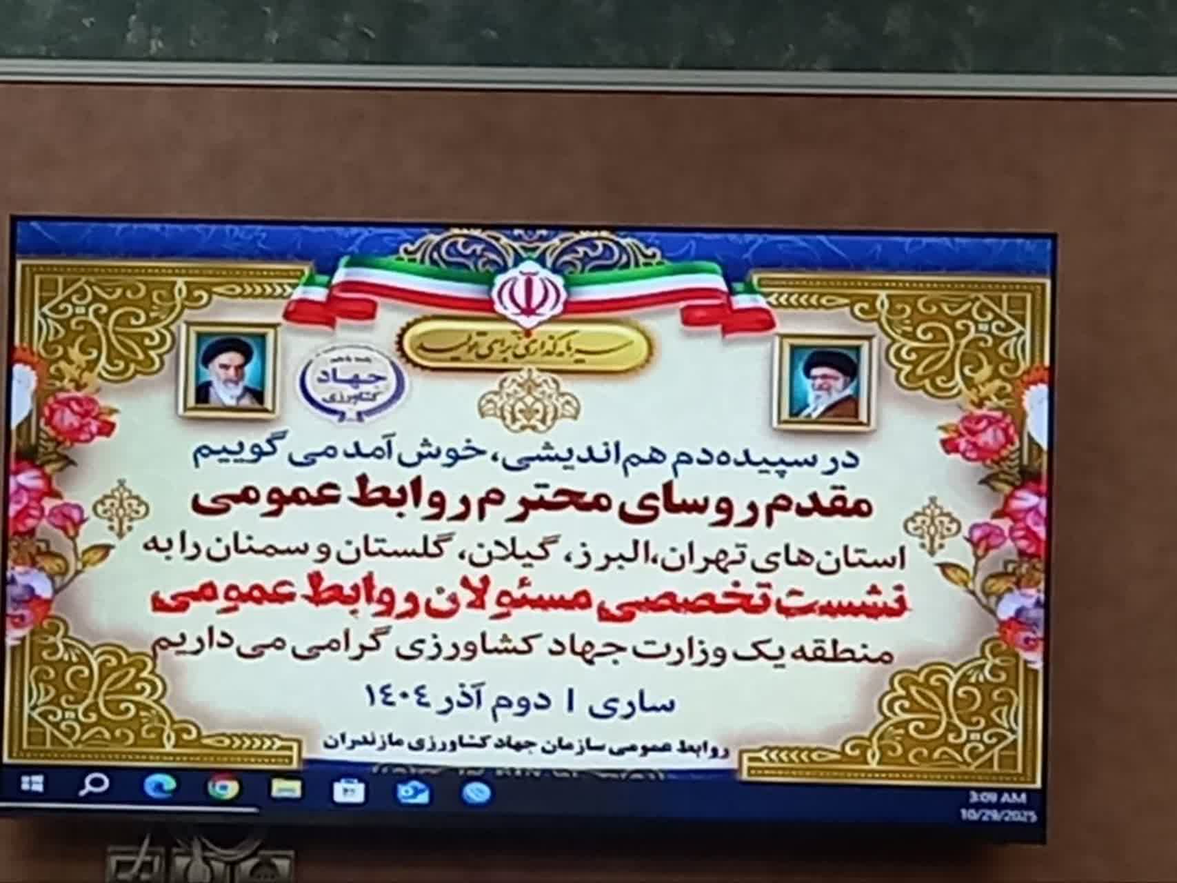 به گزارش روابط عمومی مرکز تحقیقات مازندران، نشست تخصصی روسای روابط‌عمومی وزارت جهاد کشاورزی منطقه یک کشور روز یکشنبه دوم آذرماه ۱۴۰۴ با حضور دکتر سید سجاد حسینی، مشاور وزیر و مدیر روابط‌عمومی وزارت جهاد کشاورزی و روسای روابط‌عمومی استان‌های تهران، البرز، گیلان، گلستان، سمنان و مازندران در تهران برگزار شد.