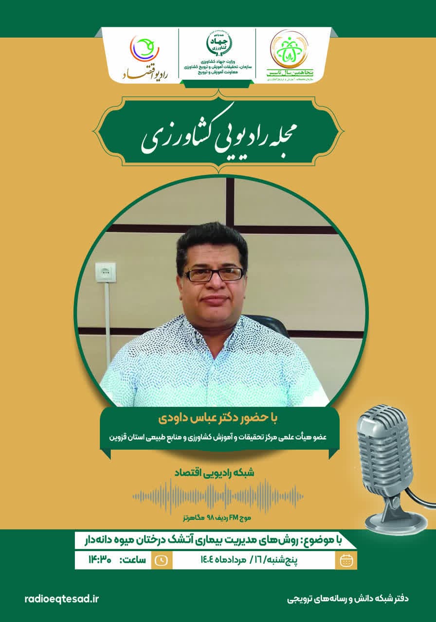 مشروح برنامه مجله رادیویی با موضوع «روش‌های مدیریت بیماری آتشک درختان میوه دانه‌دار» با حضور( دکتر عباس داودی «عضو هیئت علمی مرکز تحقیقات و آموزش کشاورزی و منابع طبیعی استان قزوین») که در تاریخ 16 مرداد ۱۴۰۴ از شبکه رادیویی اقتصاد پخش شده بود را می‌توانید از طریق لینک زیر دانلود نمایید و یا به طور مستقیم بشنوید.