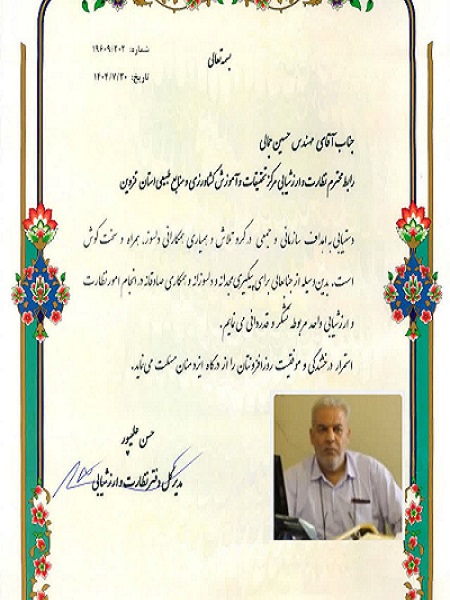تقدیر نامه برای رابط نظارت و ارزشیابی مرکز تحقیقات و آموزش کشاورزی قزوین
