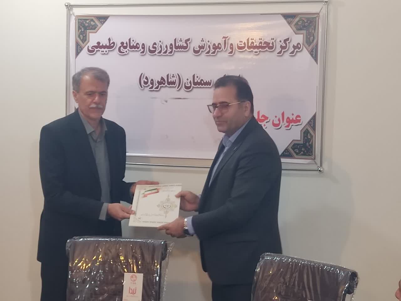 در ادامه جلسه حکم انتصاب آقای علیرضا برجسته به سمت سرپرست مرکز تحقیقات و آموزش کشاورزی و منابع طبیعی استان سمنان (شاهرود) توسط معاون پژوهش و فناوری سازمان تات به ایشان تقدیم شد.