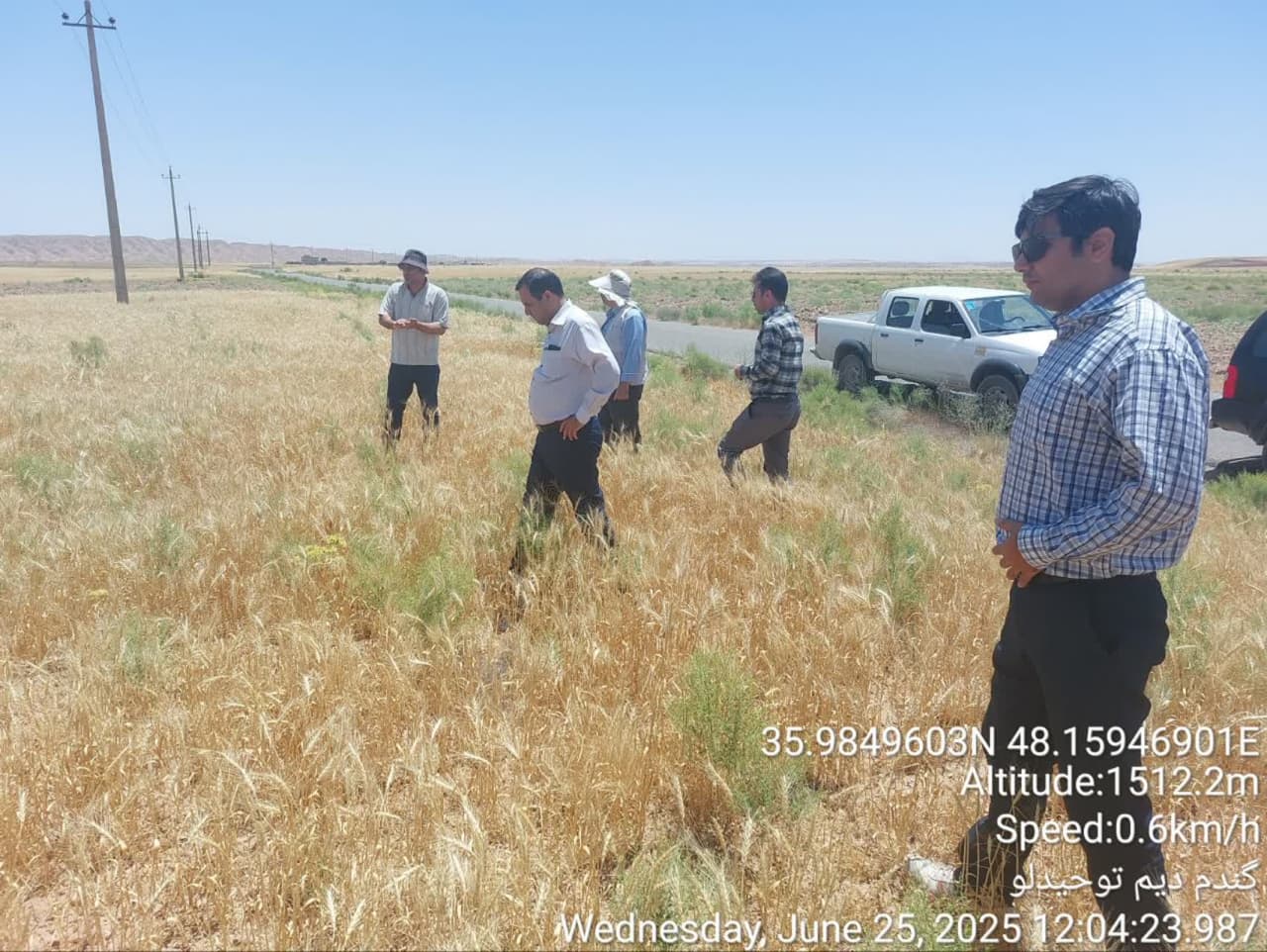 پیرو برنامه پایش مزارع گندم دیم در شهرستان‌های استان زنجان، دور چهارم پایش مزارع با برنامه بازدید در مورخ 1404/04/04 از شهرستان‌ خدابنده (مناطق زرین آباد، خلیفه قشلاق، آقچه کند، گرماب، منداق و باشقشلاق) توسط دکتر اسدی معاونت پژوهشی مرکز تحقیقات و آموزش کشاورزی و منابع طبیعی استان، مهندس اربطی کارشناس بخش تولیدات گیاهی جهاد کشاورزی استان زنجان، مهندس یوزباشی کارشناس جهاد گرماب، مهندس نظری، مهندس یوسفیان و مهندس عابدی مسئولین بیمه کشاورزی محصولات استان انجام شد. در این مناطق اثرات خسارت هر دو عامل تنش خشکی و سرما مشاهده گردید. تنش خشکی شدید و تنش گرما در مزارع این بازدید مشهود بوده و این شرایط باعث کاهش شدید وزن هزار دانه و در نهایت کاهش شدید عملکرد گردیده بود و در برخی از مزارع مورد بازدید برداشت مزارع مقرون به صرفه نبود و در نهایت مقرر گردید میزان خسارت براساس دستورالعمل های جاری صندوق بیمه برآورد گردد. در بازدیدی که از سیلوی خرید گندم منطقه گرماب انجام شد در نمونه‌های موجود در سیلو وزن هزاردانه اکثر نمونه‌ها نیز پایین بود که نشان دهنده تاثیر تنش خشکی و گرما در مزارع منطقه بود.